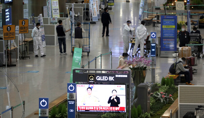 ▲ 1일 인천공항에서 코로나19 관련 뉴스가 나오고 있다. 오미크론 변이의 해외유입을 막기 위한 방역이 강화되고 있다. [영종도=연합뉴스] |