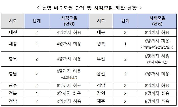 사적모임의 경우 세종(1단계)·대전(2단계)·충북(2단계)은 4명까지, 전북(1단계)·경북(1단계)은 8명까지, 울산(2단계)은 6명까지 거리두기 단계보다 더 강화된 조치를 시행하고 있다.