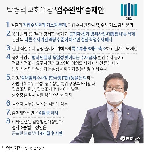 ▲ 박병석 국회의장 '검수완박' 중재안 8개항. [그래픽=연합뉴스] |