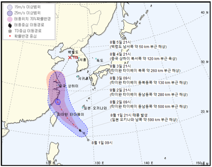 이후 중국에 상륙한 뒤 4일 오후 9시에는 중국 상하이 북서쪽 약 120㎞ 부근 육상까지 도달하고, 이후 황해를 거슬러 올라가다 5일 오후 9시에는 백령도 남서쪽 약 50㎞ 부근 해상에까지 이를 것으로 예상된다.