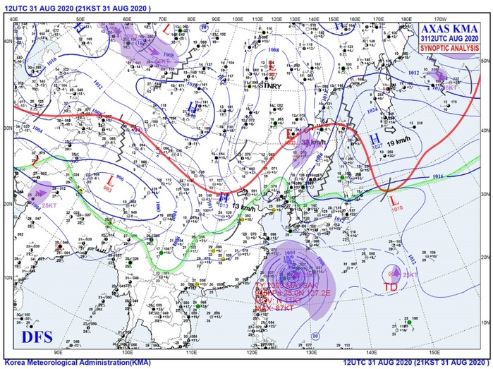기상청에 따르면, 오키나와 부근 해상에서 강력한 태풍으로 성장하고 있는 제9호 태풍 마이삭(캄보디아에서 제출한 이름으로 나무의 한 종류)은 따뜻한 바다를 거치면서 많은 수증기를 머금기 때문에 앞으로도 더욱 더 발달할 가능성이 높은 상황이다.