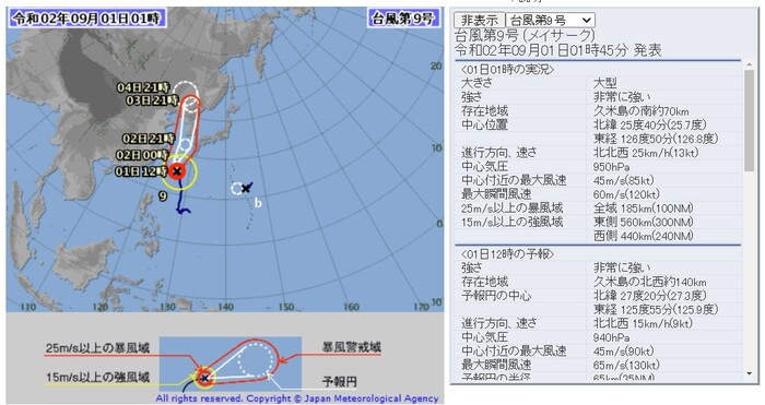 ▲ 1일 새벽 1시45분 현재 9호 태풍의 위치와 위력. 오키나와 서쪽 해상에 위치한 섬인 구메지마 남쪽 약 70km 부근 해상에 위치해 있으며 초속 60m의 순간최대풍속의 폭풍을 몰아치고 있다. 대단히 강한 대형 태풍이다. 중심기압은 950헥토파스칼(hPa)이다. [출처= 일본 기상청] |