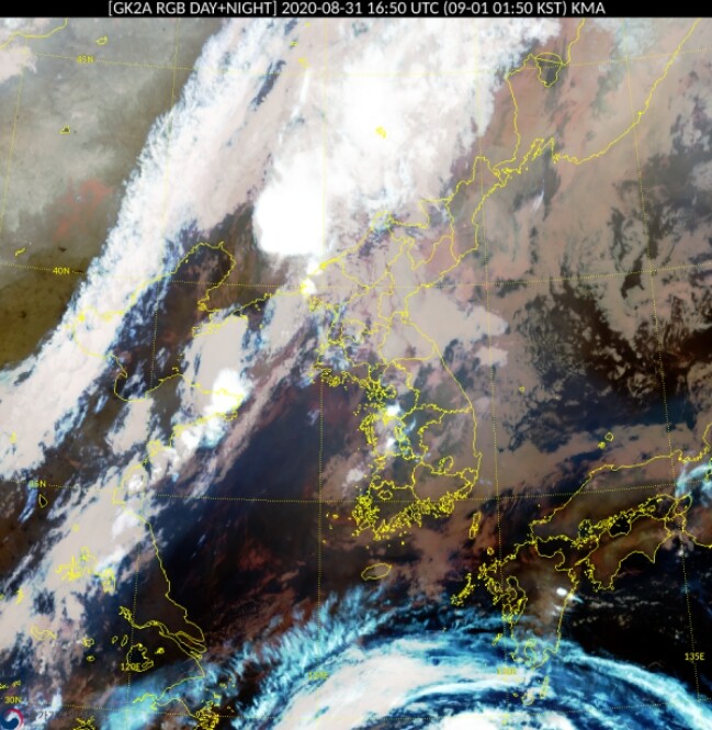 ▲ 1일 새벽 1시50분 현재 천리안위성 2A호(GEO-KOMPSAT-2A: GK2A) 영상. [출처= 기상청] |