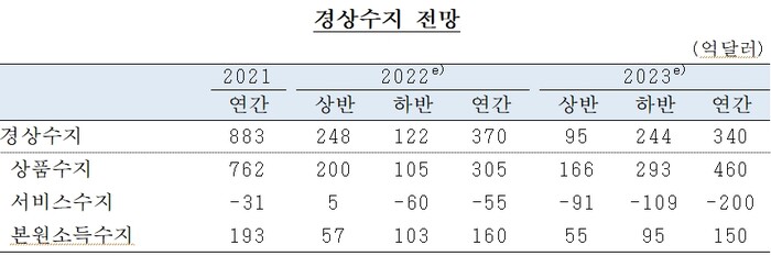 GDP 대비 경상수지 흑자 비율은 2021년 4.9%에서 올해중에 2% 초반, 내년중에 2% 내외로 하락할 것으로 예측했다.