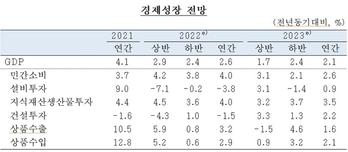 부문별로 보면, 민간소비 증가율 전망치는 3.7%에서 4.0%로 높아졌다. 민간소비는 소득여건 개선과 일상회복 지속 등으로 완만한 회복세를 이어갈 것으로 전망했다.