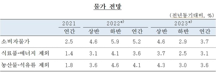 소비자물가를 반기별로 나눠보면, 올해 상반기에는 소비자물가 상승률이 4.6%로 높은 수준을 유지하고, 성장률은 1.7%까지 떨어질 것으로 추정됐다.