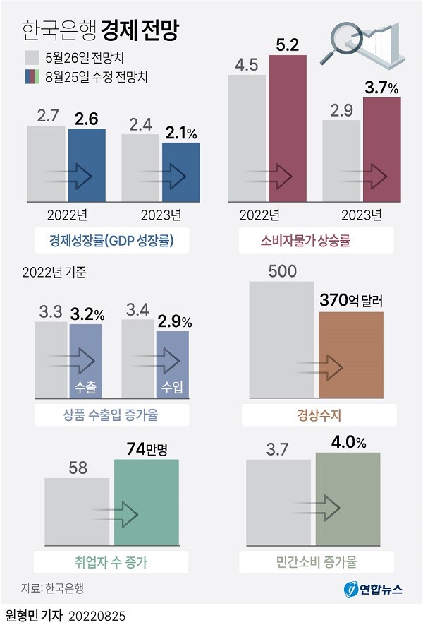 한은은 동시에 올해 연간 실질 국내총생산(GDP) 성장률 전망치도 2.6%로 더 낮췄다.