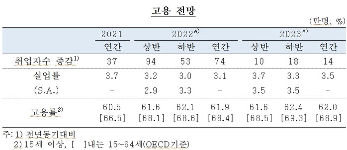 올해 취업자 수는 5월 전망(58만명)보다 74만명으로 크게 늘어날 것으로 내다봤다. 실업률 전망(3.1%)에는 변화가 없었다.
