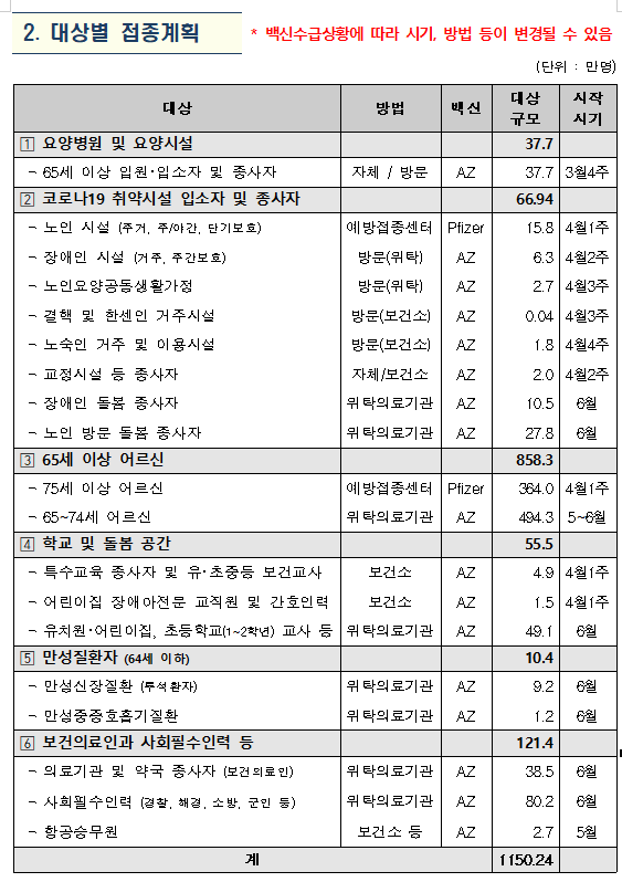 | ▲ 대상별 접종계획. [출처= 코로나19 예방접종 대응추진단 제공] |