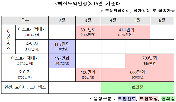 코로나19 백신은 지난 2월에 169만1천회 분이 도입 완료됐고 1610만2천회 분의 공급일정은 3월부터 6월까지 확정된 상태다. 나머지 백신에 대해서도 개별 제조사와 지속적으로 도입일정을 협의하고 있다고 추진단은 밝혔다.