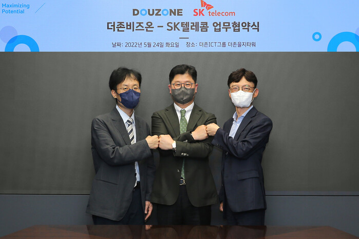 | ▲ (왼쪽부터) 최낙훈 SKT 스마트팩토리CO담당, 지용구 더존비즈온 솔루션사업부문 대표, 조정민 SKB 커넥트인프라CO 담당 [사진=SK텔레콤 제공] |