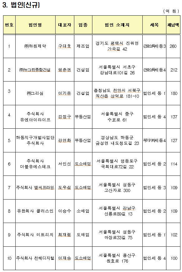 법인 중에는 근로소득세 등 260억 원을 체납한 ㈜하원제약(대표자 구대호)이 체납액 1위였다.