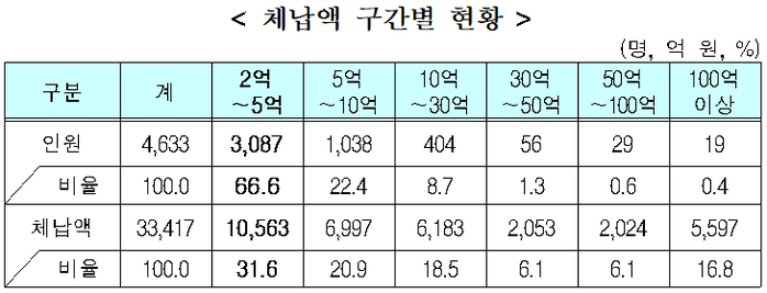 체납액이 2억~5억 원 구간에 있는 공개대상은 4732명ㆍ1조 6114억 원으로 전체 명단공개 인원 및 체납액의 각각 67.9%, 32.5%를 차지했다.