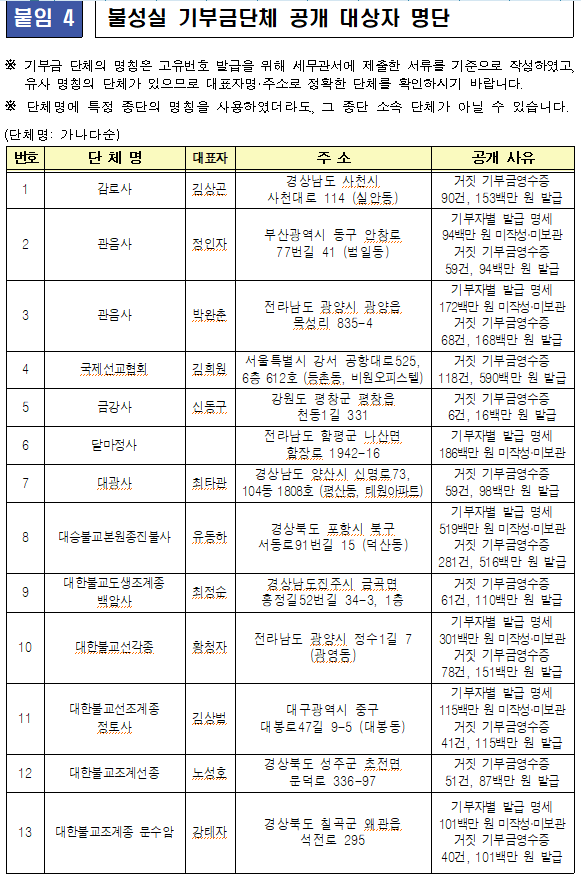 ▲ 불성실 기부금단체 공개 대상자 상위자 명단. [출처= 국세청] |