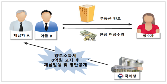 ▲ 부동산 양도대금을 자녀가 수령하고 양도소득세는 체납한 사례. [출처= 국세청] |