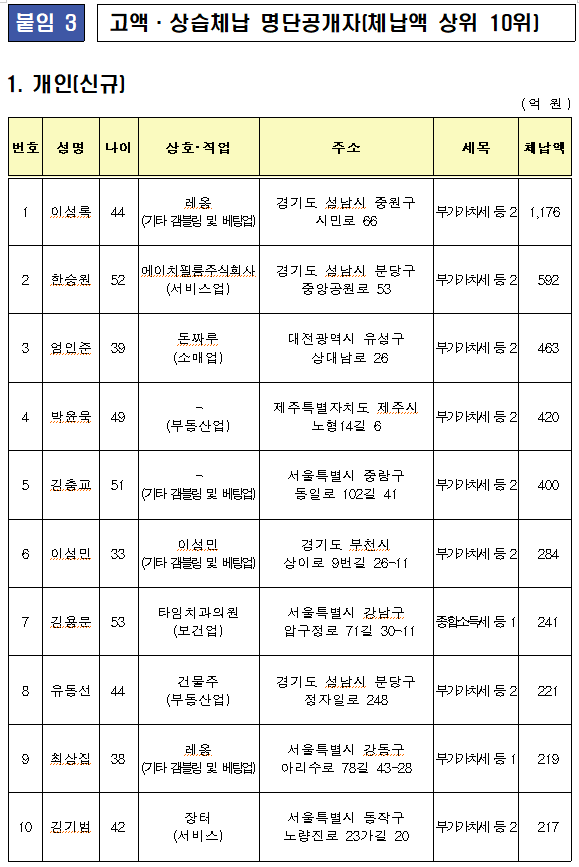 올해 신규 공개 대상자 중 개인 최고 체납액은 도박업자 이성록(44·레옹)씨다. 부가가치세 등 1175억5천만원을 체납했다. 역대 3위 체납액이다.