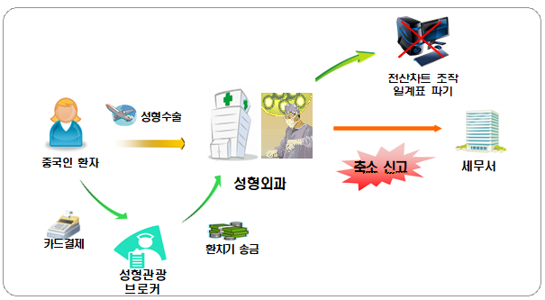 ▲ 중국인 환자의 성형수술비를 환치기로 수령하고 전산차트 등을 조작하는 방법으로 소득세 등을 포탈한 사례. [출처= 국세청] |