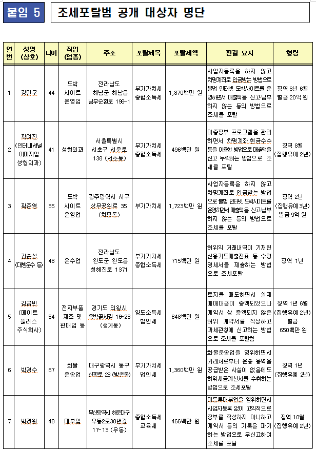 ▲ 개인 고액·상습체납 신규 명단공개자. [출처= 국세청] |