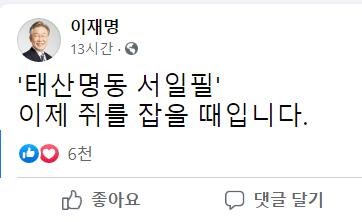 행정안전위와 국토위 국감 징검다리 날인 19일, 이 후보는 자신의 페이스북을 통해 '태산명동 서일필'이라는 고사성어와 함께 "이제 쥐를 잡을 때"라고 적어 적극적인 반격을 시사했다.
