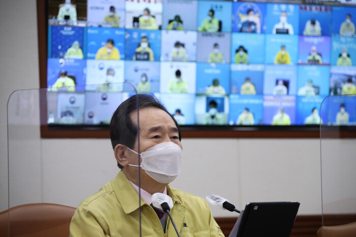 ▲ 정세균 국무총리가 24일 오전 정부서울청사에서 열린 코로나19 대응 중앙재난안전대책본부(중대본) 회의를 주재하고 있다. [사진= 연합뉴스] |