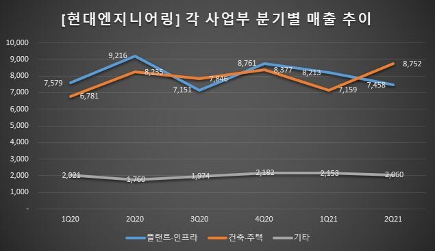 2분기 건축·주택 부문 매출액은 8752억 원으로 1분기보다 22.3%(1593억 원) 늘어난 반면, 플랜트·인프라 부문은 7458억 원으로 9.2%(755억 원) 줄어 2분기 연속 감소세를 나타내고 있다.