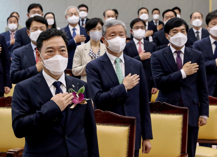 ▲ 김오수 신임 검찰총장이 1일 오후 서울 서초구 대검찰청에서 열린 취임식에서 국민의례를 하고 있다. [사진=연합뉴스] |