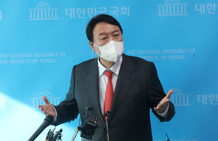 ▲ 국민의힘 윤석열 대선 경선 예비후보가 8일 오후 서울 여의도 국회 소통관에서 '고발사주' 의혹 관련 기자회견을 마치고 취재진 질문에 답하고 있다. [국회사진기자단=연합뉴스] |