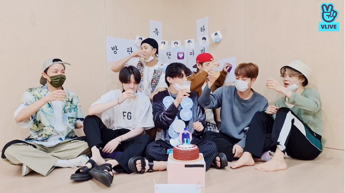 | ▲ 방탄소년단(BTS)이 1일 오후 네이버 브이라이브로 진행한 라이브 방송에서 빌보드 메인 싱글 차트 '핫 100' 1위 등극을 팬들과 함께 축하하기 위해 랜선 파티를 하고 있다. [사진= 방탄소년단 브이라이브 캡처] |