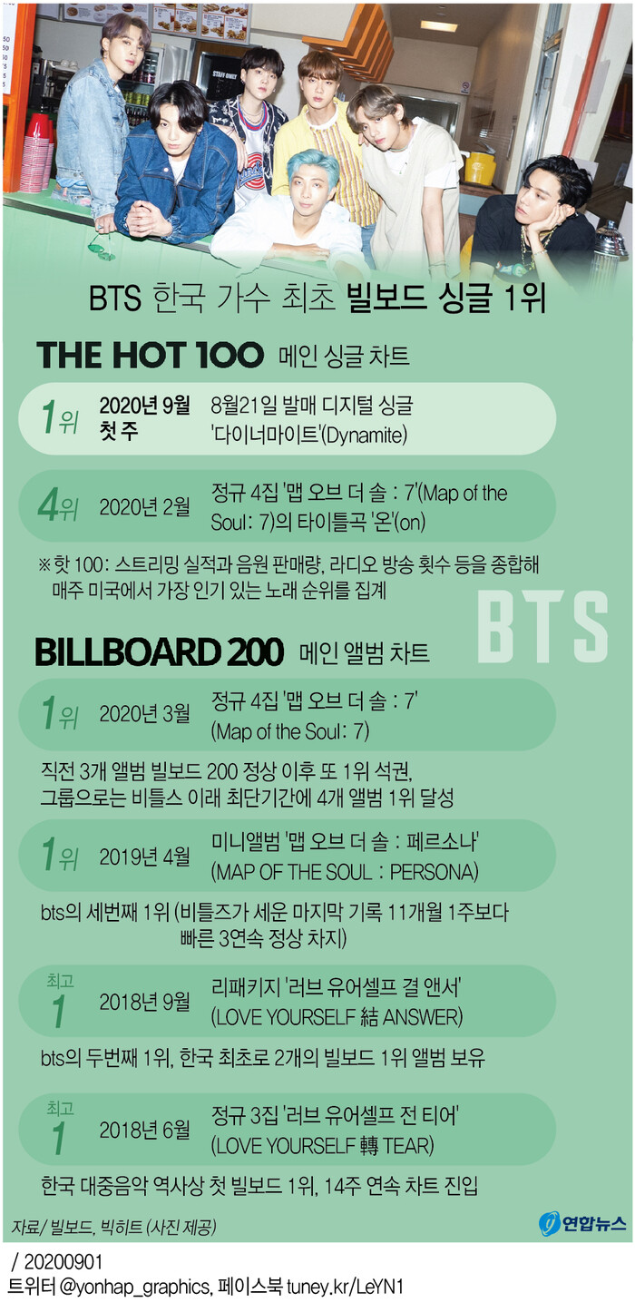 | ▲ 방탄소년단(BTS) 한국 가수 최초 빌보드 핫 100 싱글 차트 1위 등극. [그래픽= 연합뉴스] |