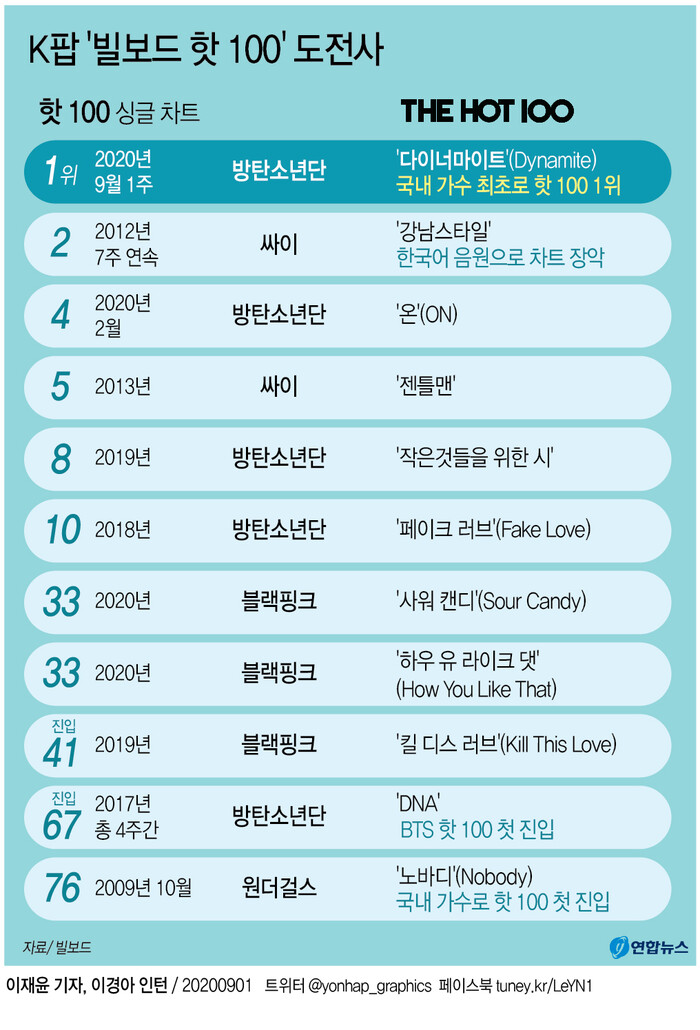 | ▲ K팝 '빌보드 핫 100' 도전사. [그래픽= 연합뉴스] |