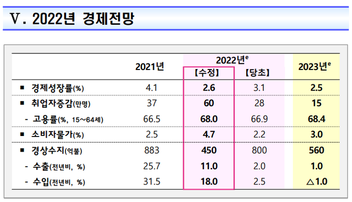 | ▲ 2022년 경제전망 전망치. [기획재정부 제공] |
