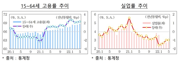 | ▲ 15~64세 고용률 추이(왼쪽)와 실업률 추이. [기획재정부 제공] |