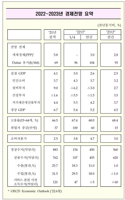 | ▲ 2022~2023년 경제전망 요약. [기획재정부 제공] |