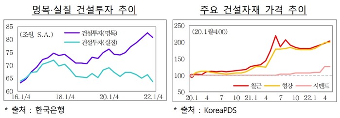| ▲ 명목·실질 건설투자 추이(왼쪽)와 중 건설자재 가격 추이. [기획재정부 제공] |
