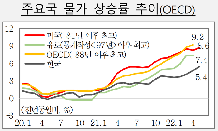 러시아의 우크라이나 침공 등으로 원유와 곡물 같은 국제 원자재 가격이 급등하는 등 해외발 공급 측 요인에다, 사회적 거리두기 해제와 해외여행 재개 등으로 수요 회복이 더해지며 높은 물가 상승세를 지속하고 있는 양상이다.