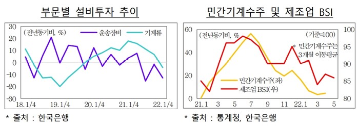 | ▲ 부문별 설비투자 추이(왼쪽)와 민간기계수주 및 제조업 기업경기실사지수(BSI). [기획재정부 제공] |