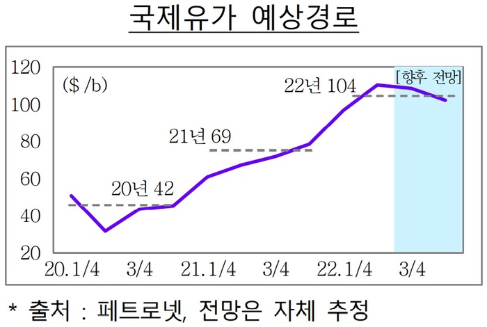 정부는 올해 유가(두바이유 기준) 전망치도 종전 배럴당 평균 73달러에서 104달러로 31달러나 올려잡았다.