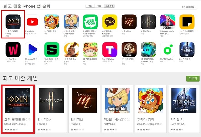 | ▲ '오딘: 발할라 라이징' 애플 앱스토어·구글플레이 매출 1위 |