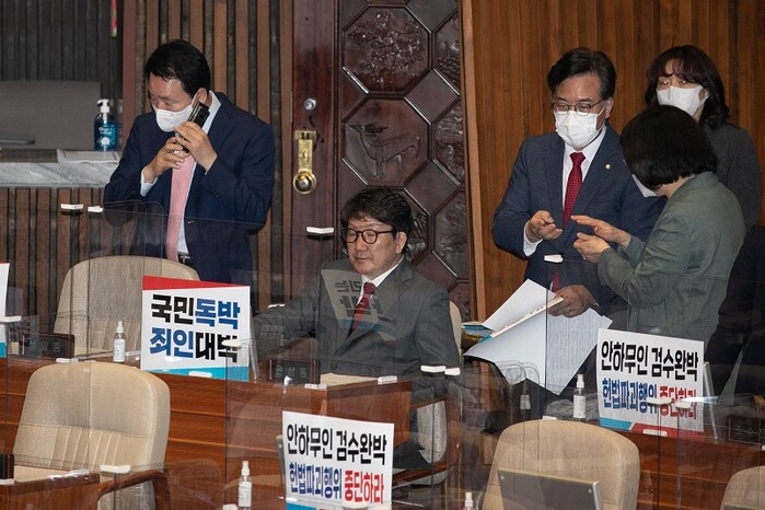 반면 국민의힘은 민주당과 박병석 국회의장이 일방적으로 법안 표결을 강행한다고 비판하며 표결에 불참했다.
