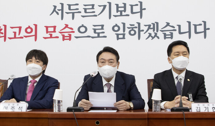 ▲ 국민의힘 윤석열 대선 후보가 25일 국회에서 열린 최고위원회의에서 선거대책위원회 구성에 대해 발언하고 있다. 왼쪽부터 이준석 대표, 윤 후보, 김기현 원내대표. [국회사진기자단=연합뉴스] |