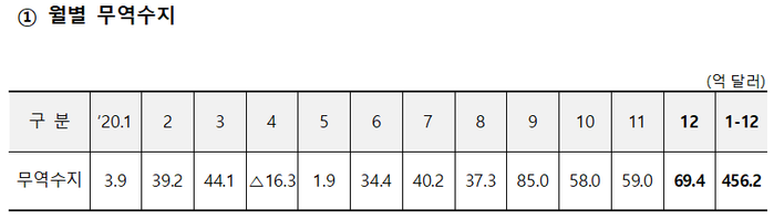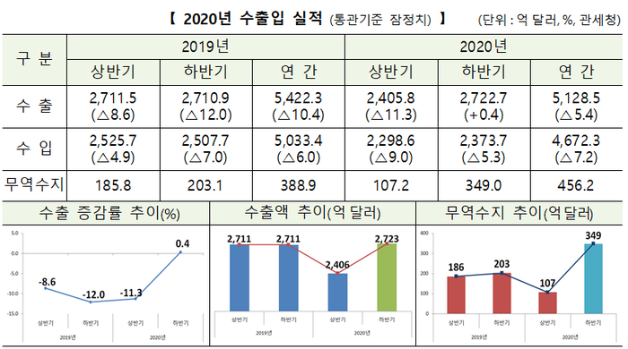 ▲ 2020년 수출입 실적 및 무역수지 추이. [출처= 산업통상자원부] |