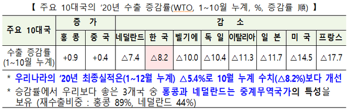 세계무역기구(WTO) 통계에 따르면 지난해 10월 누계로 우리나라(-8.2%)는 수출 증감률 면에서 10대 수출국 가운데 중국(+0.4%), 홍콩(+0.9%), 네덜란드(-7.4%)에 이어 4번째로 양호했다. 우리나라의 작년 최종 수출실적은 -5.4%로 10월 누계 수치(-8.2%)보다 개선됐다.