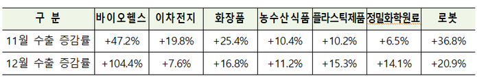 시스템반도체, 진단키트, 친환경차(전기차+수소차), 화장품, 농수산식품 등의 신성장수출품목 모두가 연간 최고 수출실적을 달성했다.