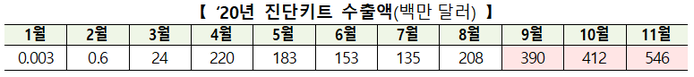 특히 바이오헬스 품목 중 진단키트 수출은 5억5천만달러로 3개월 연속(9월 3.9억→10월 4.1억→11월 5.5억) 최고치를 경신했다.