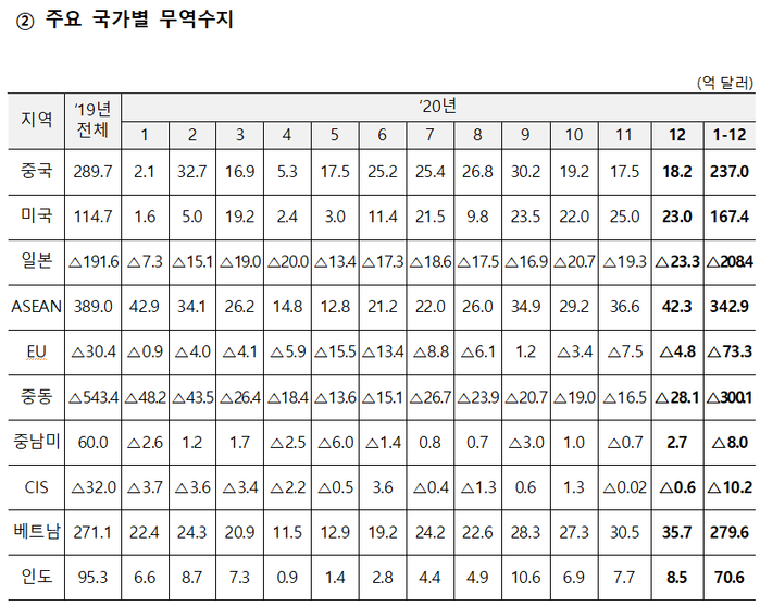 ▲ 주요 국가별 무역수지. [출처= 산업통상자원부] |