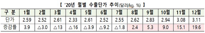 ▲ 2020년 월별 수출단가 추이. [츌처= 산업통상자원부] |