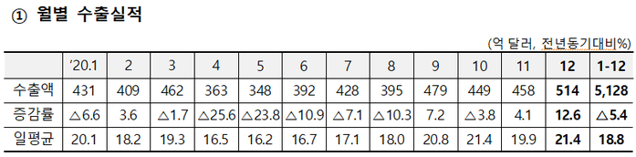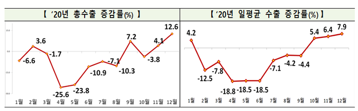 11월에 이어 총수출은 두 달 연속 늘었고, 하루 평균 수출은 10월부터 3개월 연속 증가(10월 5.4%→11월 6.4%→12월 7.9%)했다.