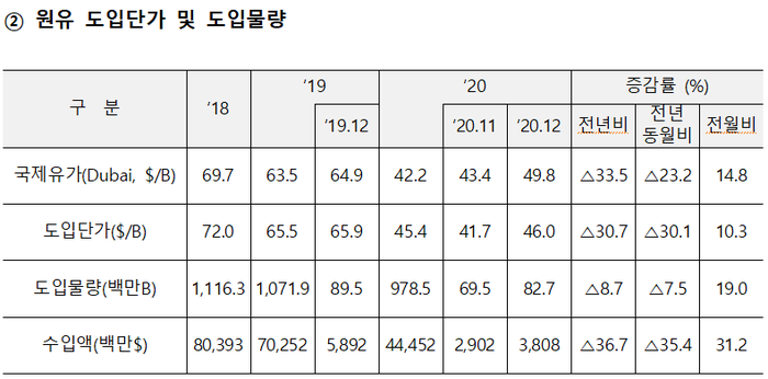 ▲ 원유 도입단가 및 도입물량. [출처= 산업통상자원부] |