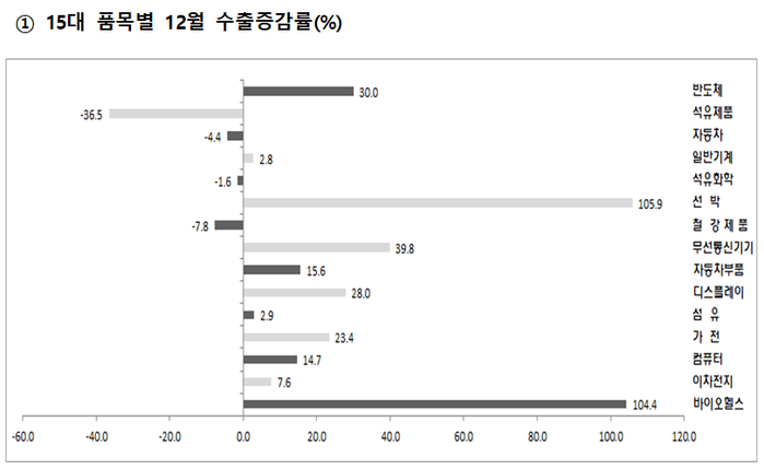 ▲ 15대 품목별 12월 수출증감률. [츌처= 산업통상자원부] |