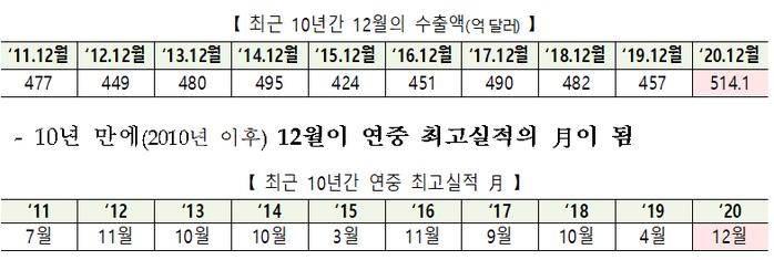 ▲ 최근 10년간 12월의 수출액. 최근 10년간 연중 최고 실적 월. [출처= 산업통상자원부] |